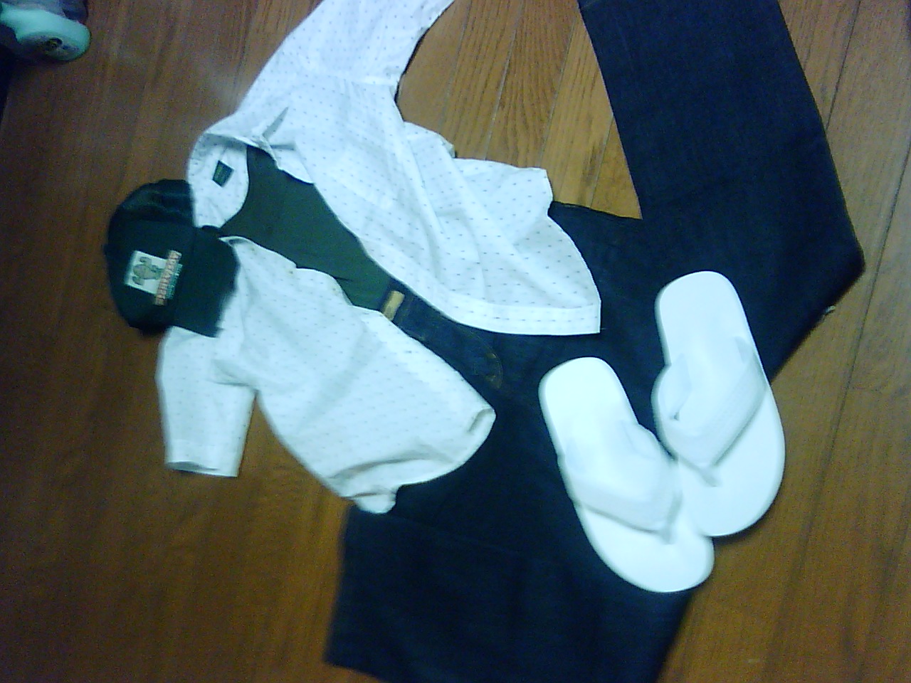 気に入ったものがあり、それ(3980円)に決定。それにあわせて、半袖のシャツ(990円)、深緑のタンクトップ(500円)、白いサンダル(1000円)、深緑の帽子(500円)を買いました。